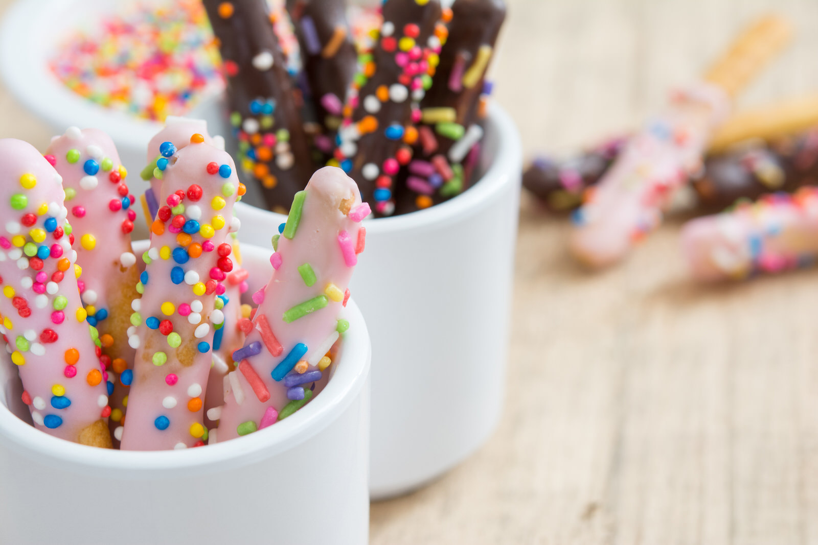 Primero, cogemos por un extremo la rosquilleta. Después, la bañamos hasta máximo la mitad de su longitud en el chocolate fundido y, por último, sobre un platito, espolvoreamos el topping elegido (recuerda que pueden ser varios distintos para darle un aspecto multicolor).